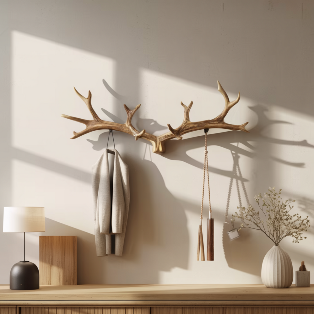 The Antura Hook Rack draws inspiration from the sculptural beauty of deer antlers, reimagined in warm solid wood. Each branch extends gracefully, functioning as a natural hook while maintaining a seamless organic silhouette. The design captures the balance of Rustic Minimalism — artistic yet understated, elegant yet purposeful.