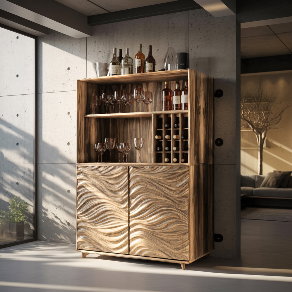 The Seawave Carved Solid Wood Bar Cabinet highlights the essence of Organic Modern design through its flowing wave-carved doors. The sculpted front panels create a natural rhythm reminiscent of ocean currents, adding movement and depth without overwhelming the space. Its clean structure, rounded edges and warm tones make it an elegant fit for Japandi, Mediterranean Natural, Contemporary Rustic and modern loft interiors.