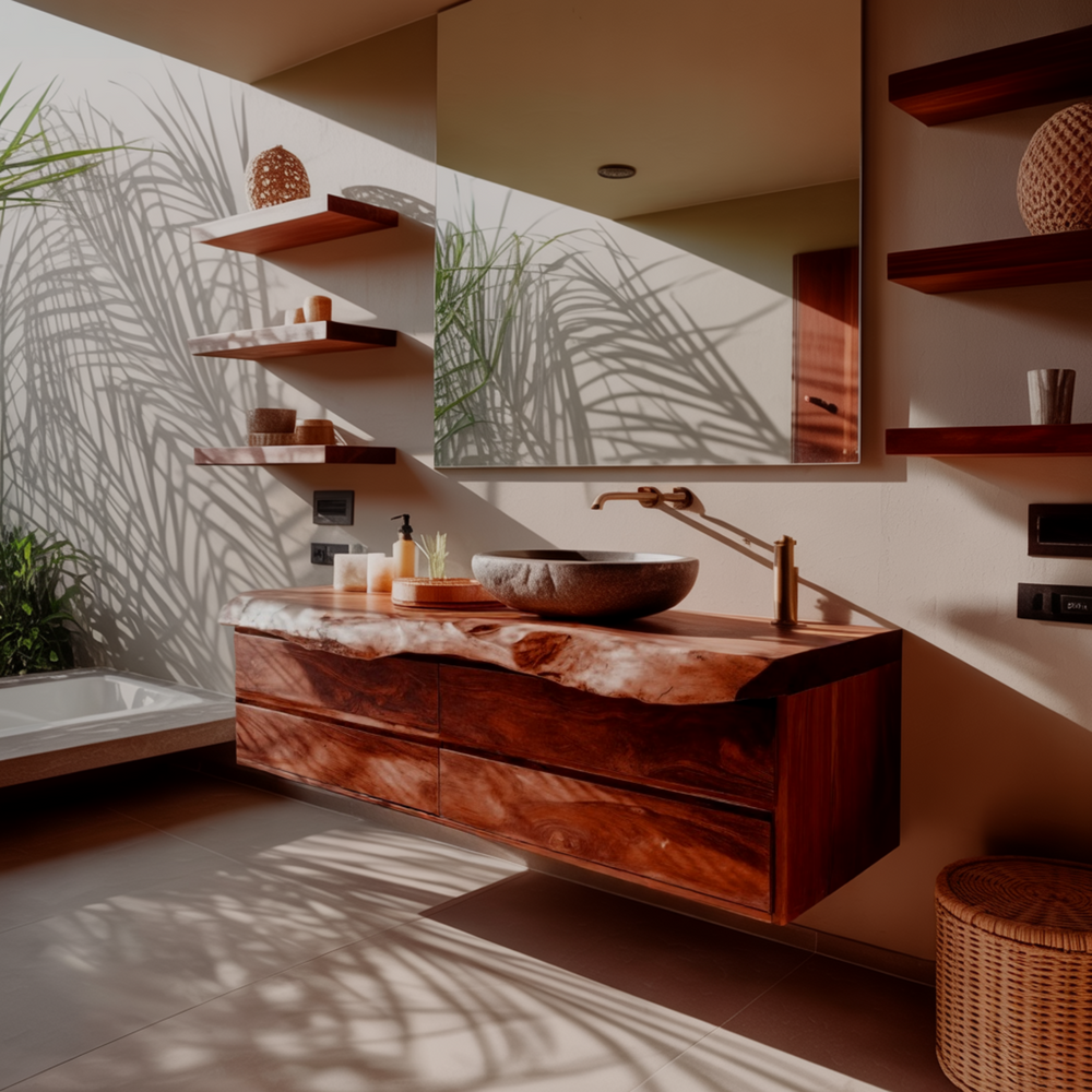 Its naturally flowing live edge resembles ocean-carved stone, while the floating installation creates a bright, airy presence ideal for serene, spa-like interiors.