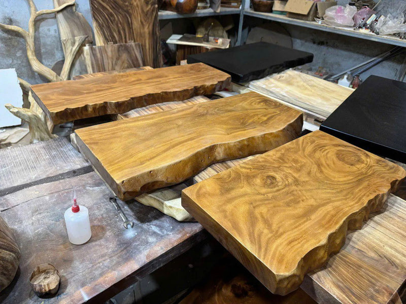 We primarily work with solid natural woods such as Monkey Pod, Oak, Pine, Acacia, and reclaimed wood. The wood type may vary depending on the design and availability, but all pieces are carefully selected for strength and character.