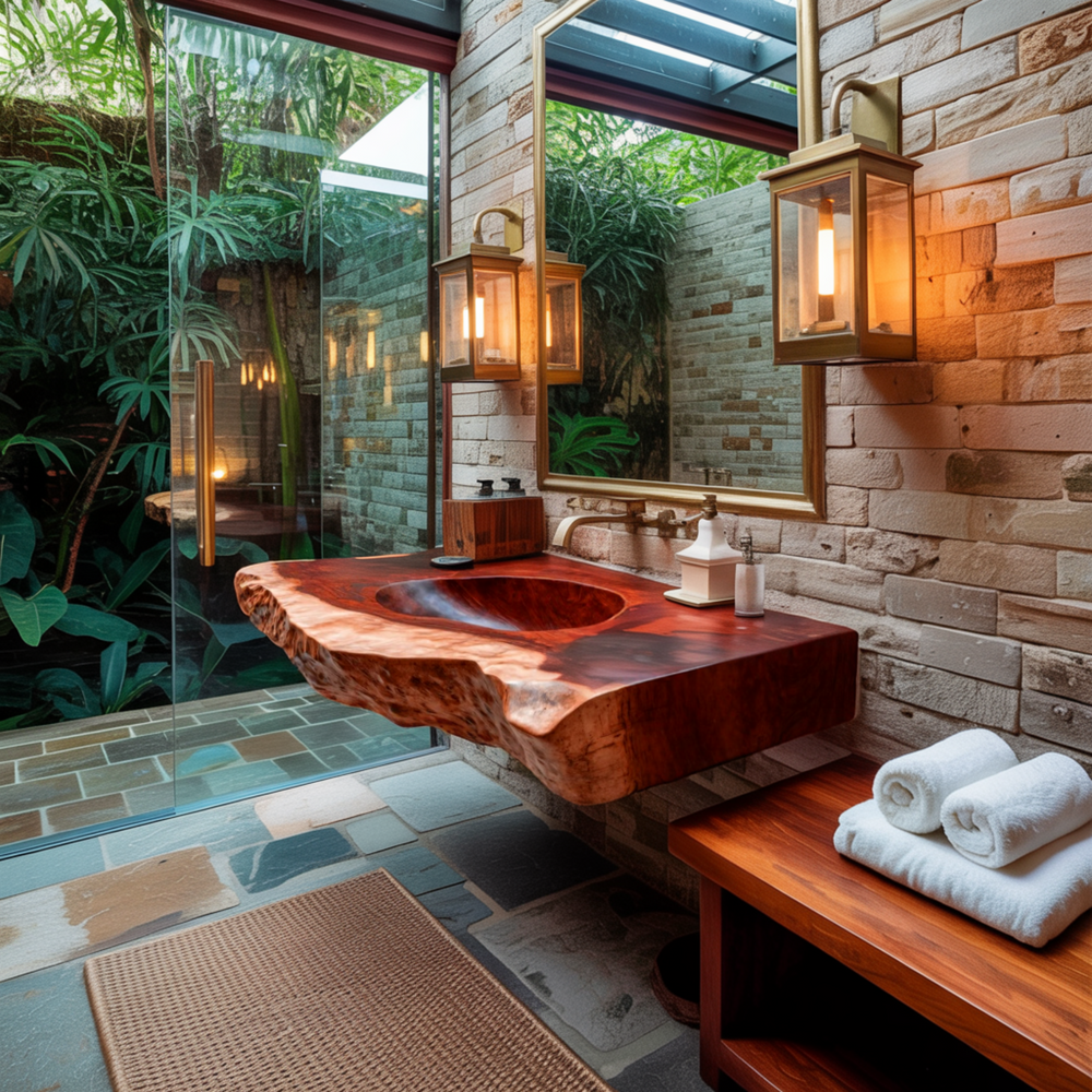• Floating solid wood bathroom vanity with integrated carved sink.