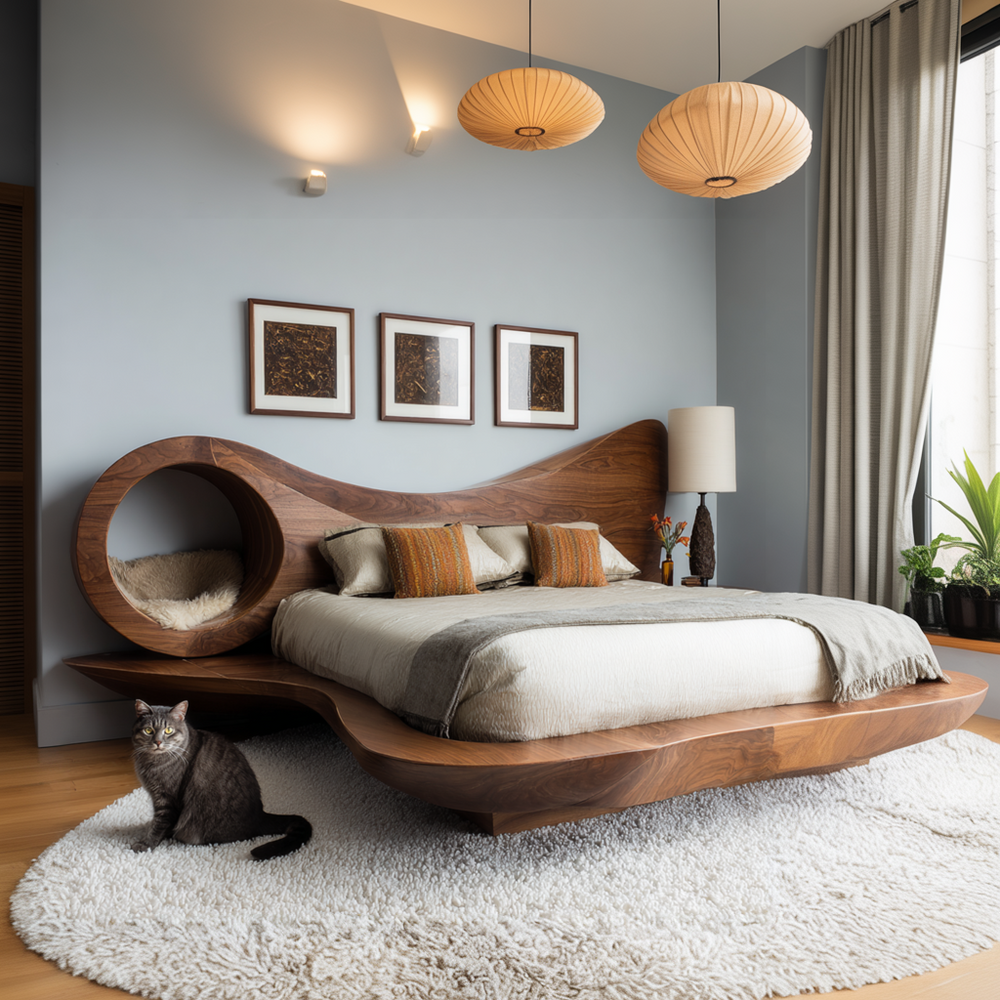 This Auraloop variation introduces a bold circular chamber into the headboard, creating a functional sculpture that blends architecture and comfort. Its low-floating platform and flowing silhouette make it a statement centerpiece for curated, modern bedroom sanctuaries.