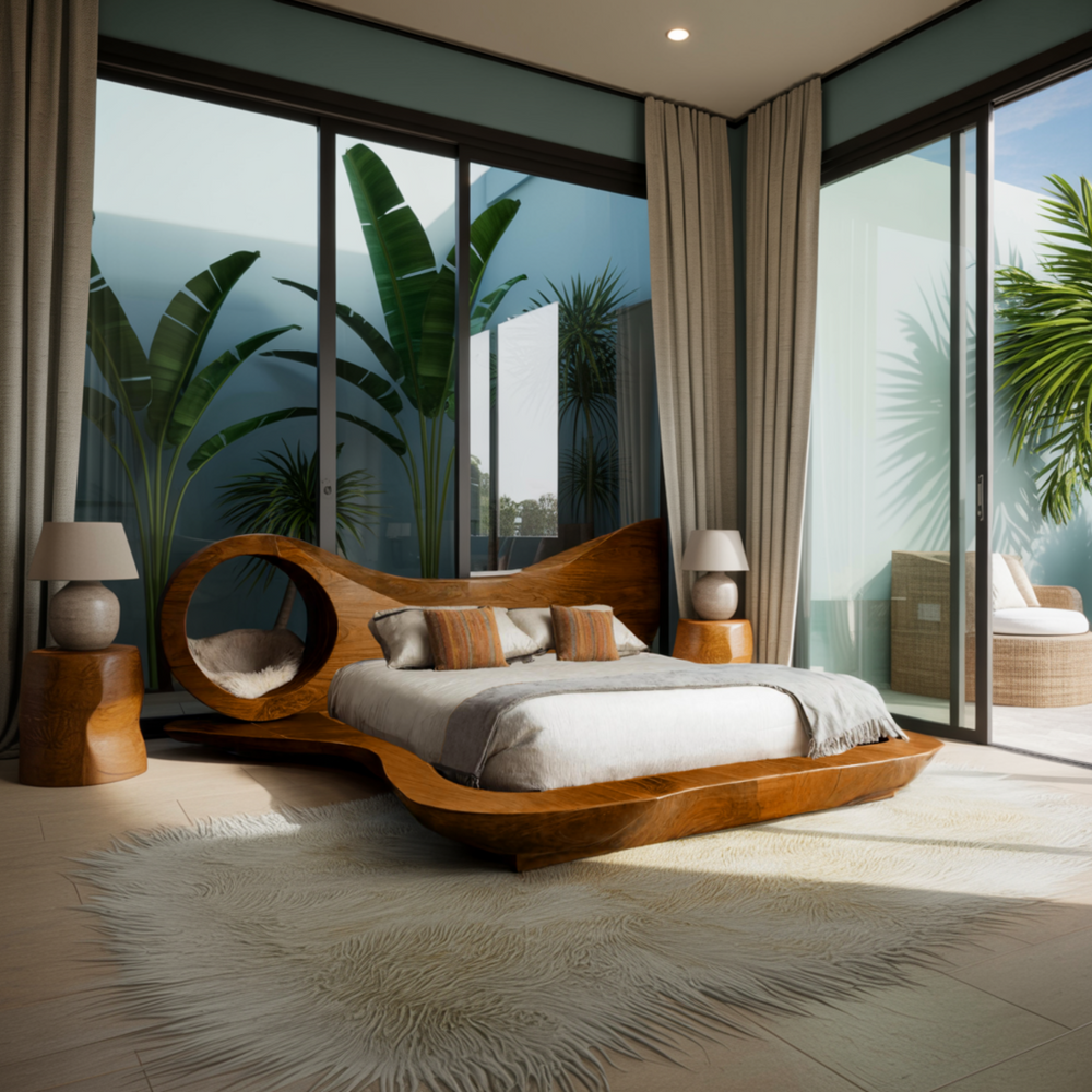 Ideal for luxury Organic Modern, Japandi, and Earth-Toned Contemporary settings. This showpiece bed elevates premium master suites within the Timberustic bedroom furniture collection, especially when paired with soft lighting and indoor greenery.