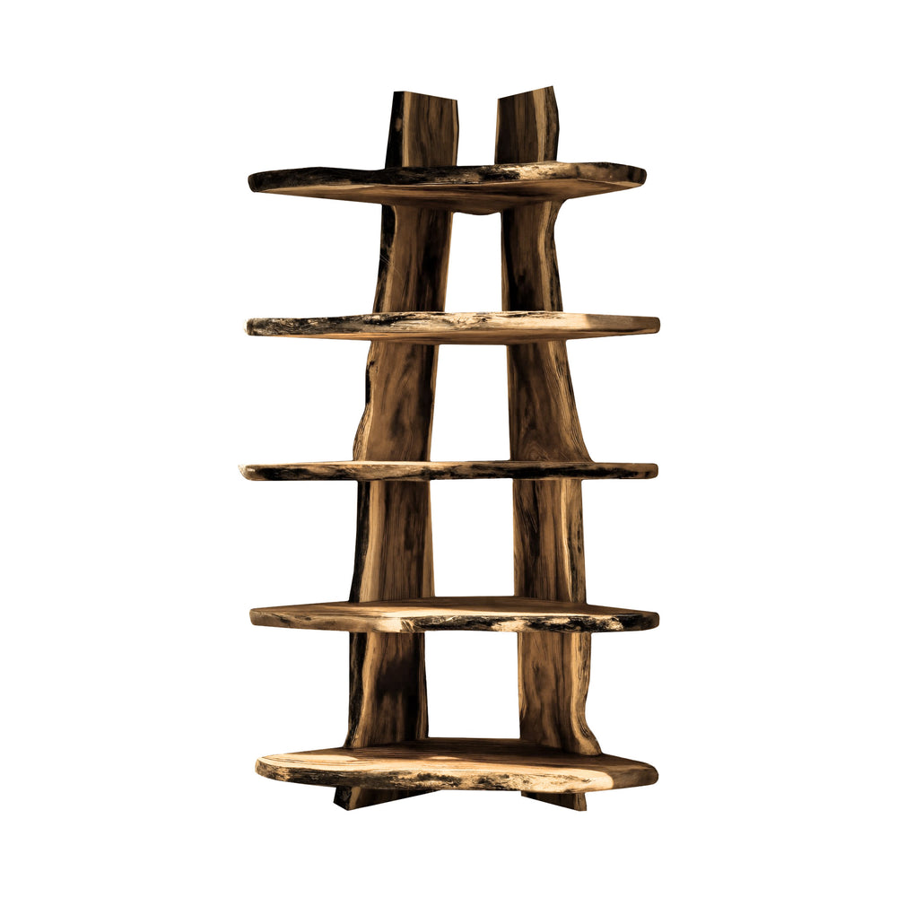 The Forestline Live Edge Solid Wood Corner Bookshelf brings a striking blend of rustic character and organic modern sensibility. Its natural live-edge shelves preserve the raw contours of the wood, giving each piece an expressive silhouette that feels hand-hewn and timeless. This sculptural form makes it suitable for interiors ranging from Rustic to Japandi, Organic Modern, and Warm Minimalist. The corner-forward design maximizes unused vertical space while adding a warm, earthy focal point to the room.
