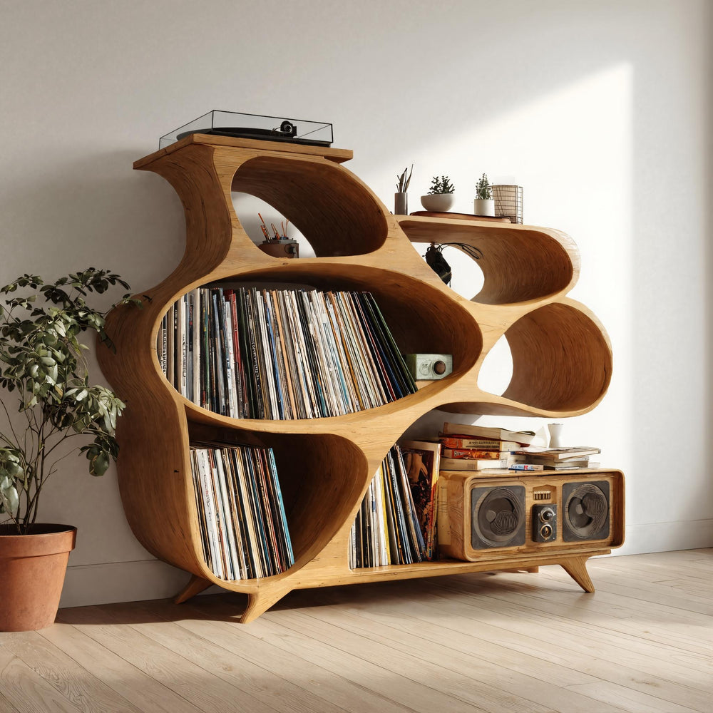 Merging Organic Modern warmth with Mid-Century sensibility, this bookshelf combines natural tactility with artistic geometry. The layered compartments offer both structure and spontaneity — ideal for books, vinyls, or curated décor pieces that express individuality and calm.