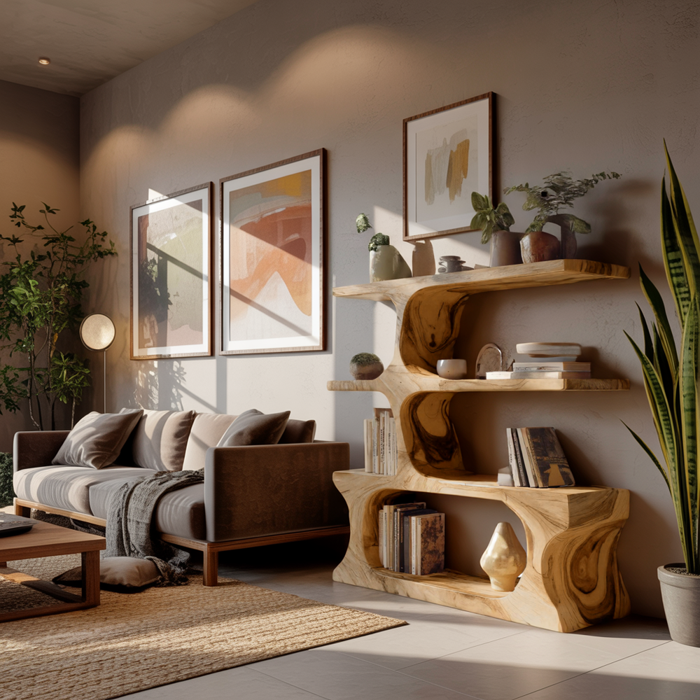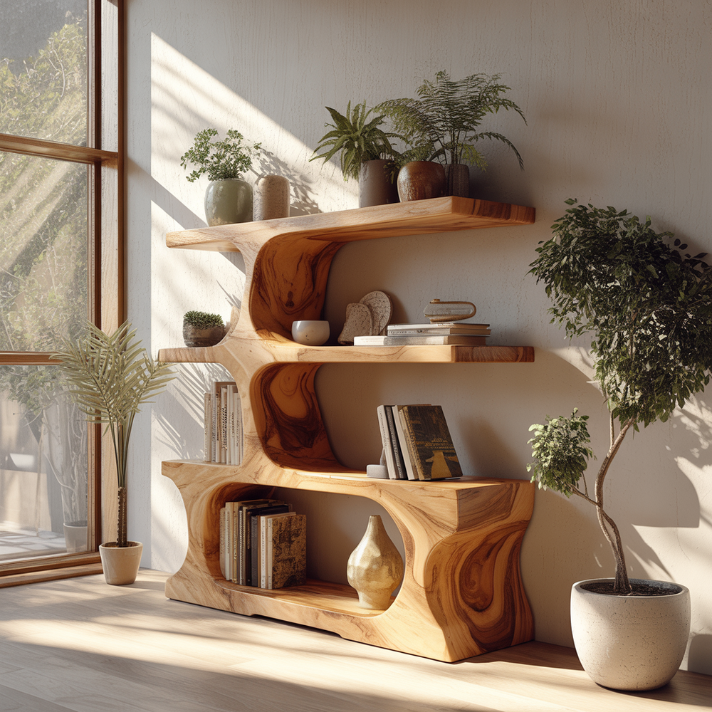 The Wavecrest Sculpted Solid Wood Bookshelf embraces the fluid aesthetics of Organic Modern design through its soft, wave-inspired curves and seamless tiered structure. Each shelf appears to flow naturally into the next, creating a sculptural form that feels both calming and dynamic. Its warm wood tone and rhythmic silhouette make it ideal for Japandi, Mediterranean Natural, Wabi-Sabi and nature-inspired contemporary interiors.