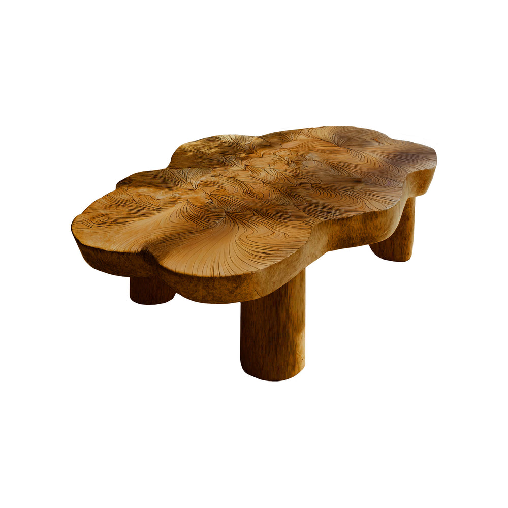 Its tabletop is carved into flowing petal forms, capturing the light and shadow of natural movement.