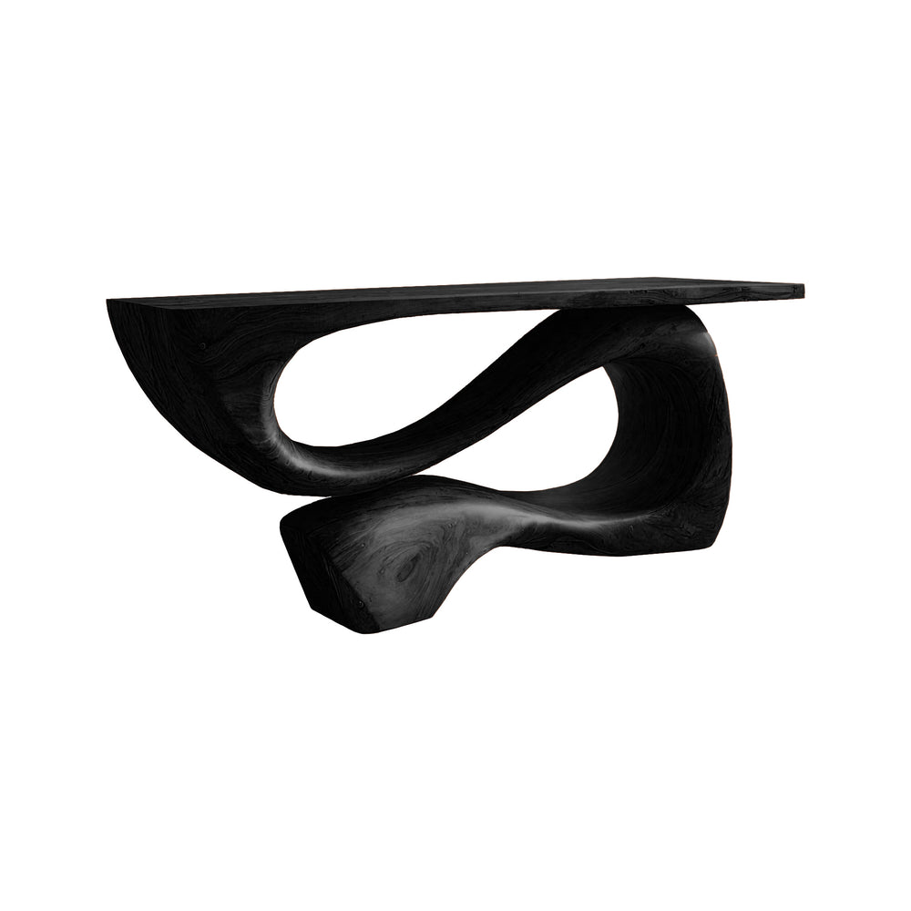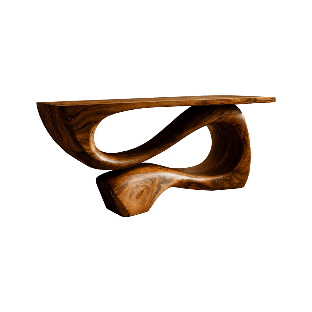 - Sculpted solid wood console table with a continuous flowing base.