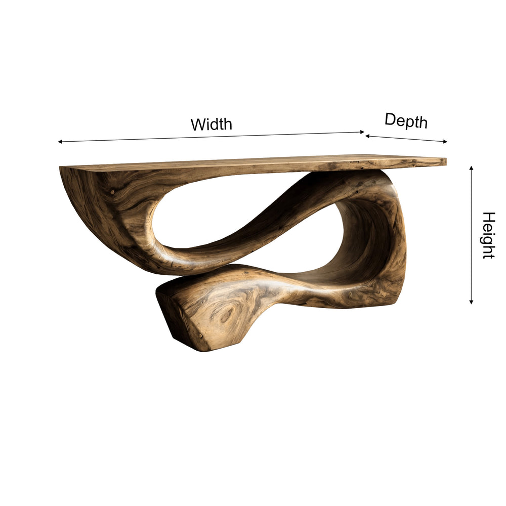The Nalore Console Table is shaped as a fluid architectural gesture, where solid wood bends into a continuous ribbon of form and void. Its sculpted base flows in an organic loop, lifting the tabletop while carving negative space beneath—an interplay that feels both grounded and weightless. The design avoids symmetry and straight lines, favoring movement, softness, and visual rhythm.