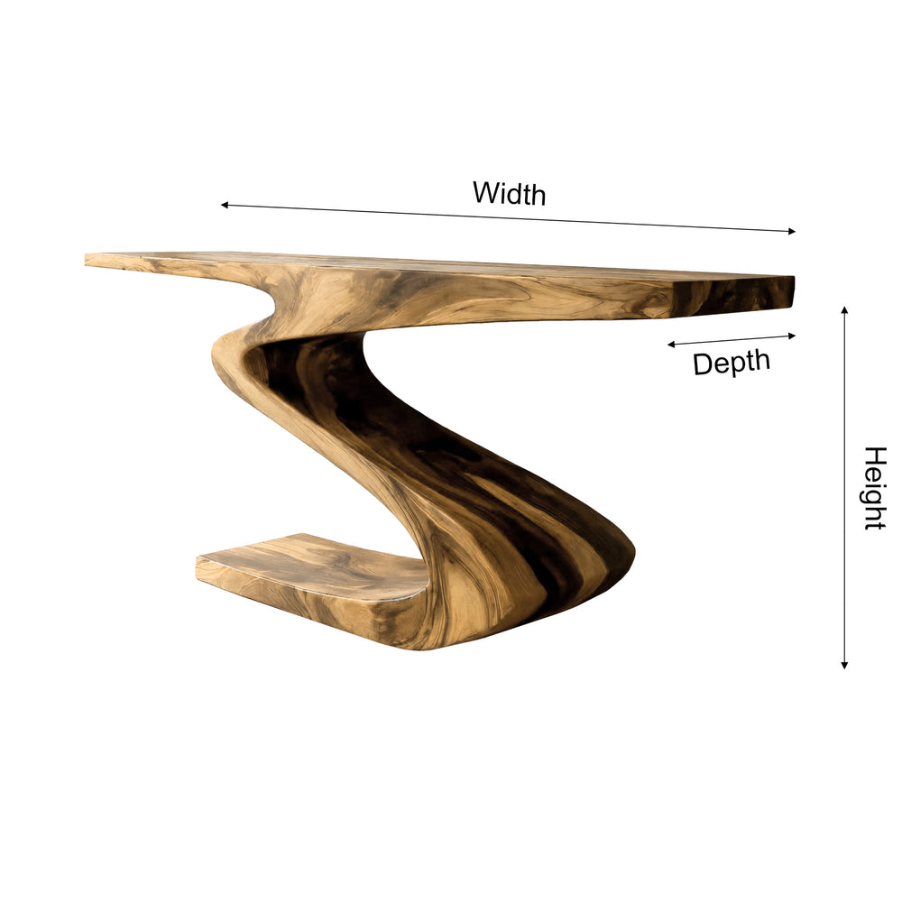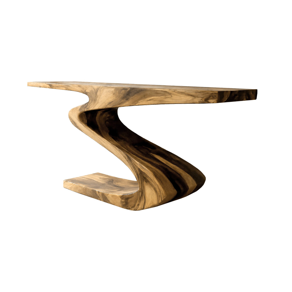 - Sculpted solid wood console table with a continuous flowing silhouette.