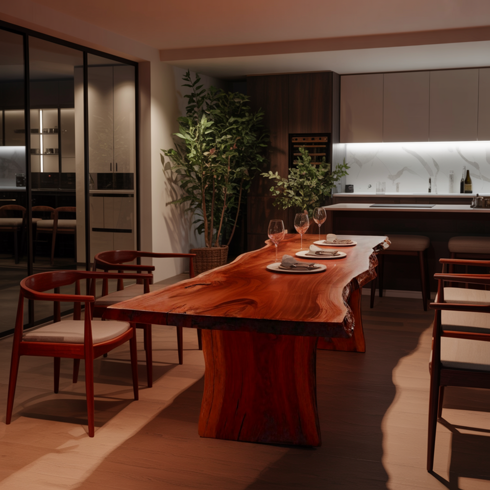 The Ridgewood Live Edge Solid Wood Dining Table celebrates the raw beauty of nature through a striking blend of Rustic, Organic Modern and Industrial Loft aesthetics. The naturally contoured live-edge tabletop retains the organic silhouette of the original tree, while the substantial sculpted base grounds the piece with monolithic strength. Its warm tones and expressive grain complement spaces that embrace authenticity—loft apartments, modern rustic homes and design-forward dining rooms seeking both character and refinement.