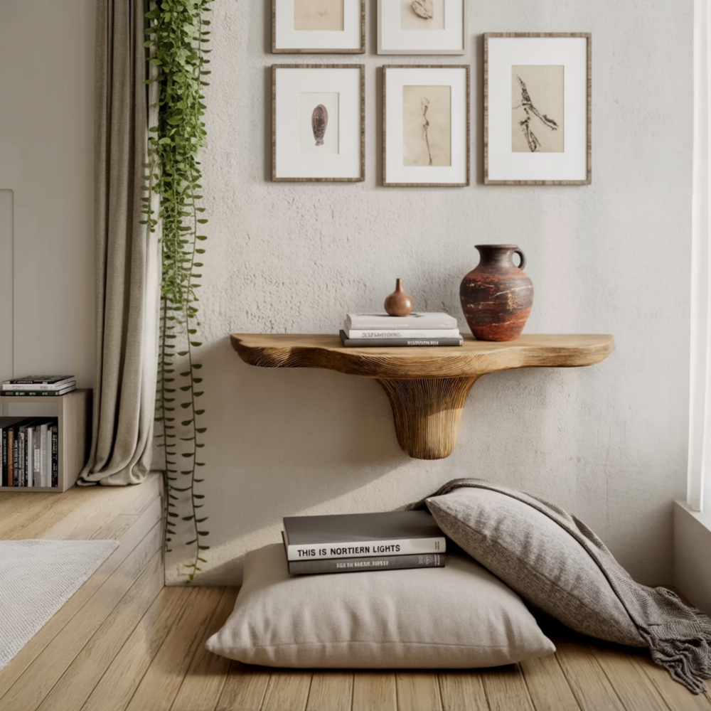 The design draws inspiration from the organic patterns of fungi and tree bark — calm, sculptural, and seamlessly integrated with nature. It bridges Organic Modern warmth with Japandi restraint, offering a timeless shelf that feels as if it has grown from the wall itself.