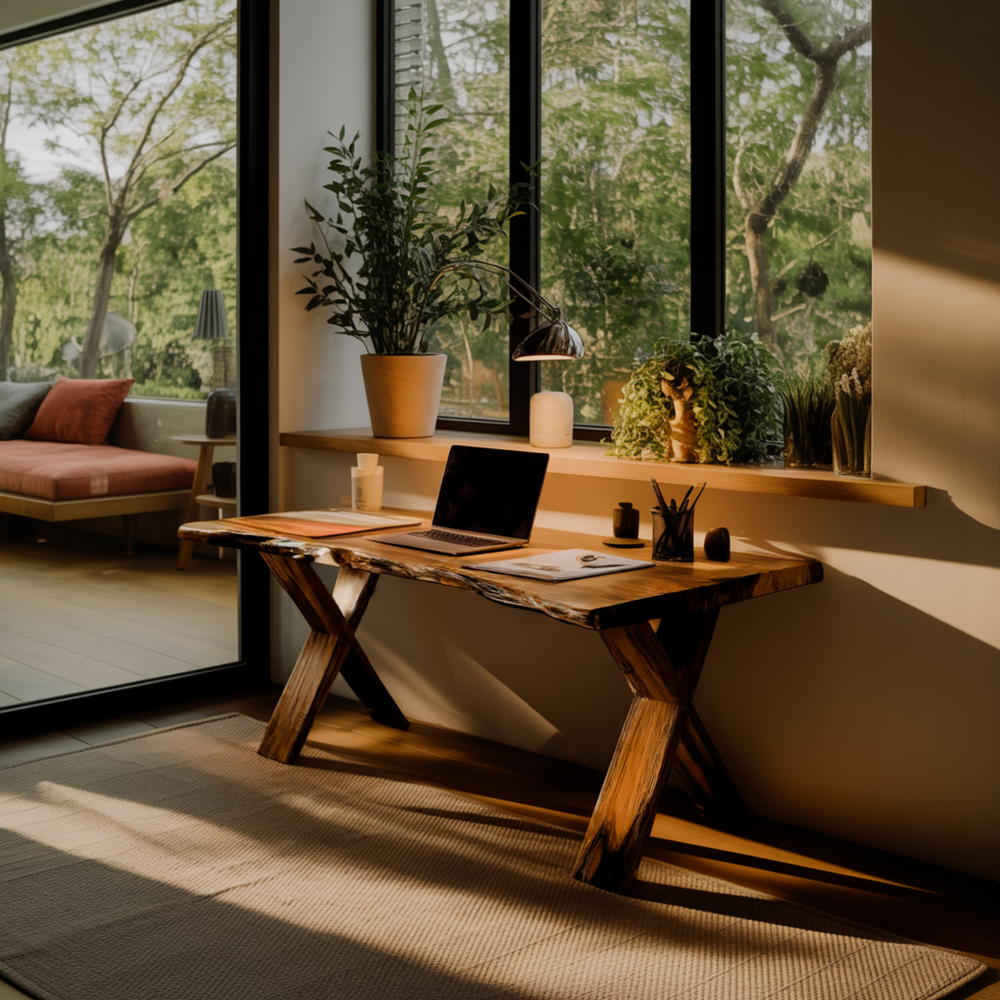The Crosscrest Live Edge Solid Wood Desk blends the elegance of Organic Modern design with the structural confidence of a sculptural X-frame base. The live edge tabletop highlights natural curves and grain movement, offering a warm, grounded presence. The crossed legs introduce architectural balance—light yet strong—making the desk ideal for modern home offices, creative studios and Scandinavian-Japandi interiors seeking natural harmony and visual stability.