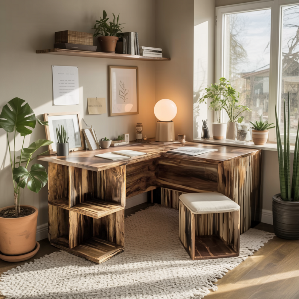The Ravon Desk brings organic character into the modern workspace through its geometric L-shape form and rich natural wood grain. Its clean angles and grounded proportions balance functionality with calm sophistication, creating a serene setting for focused work or creative flow. The design evokes a sense of harmony — sculptural yet simple, contemporary yet deeply natural.