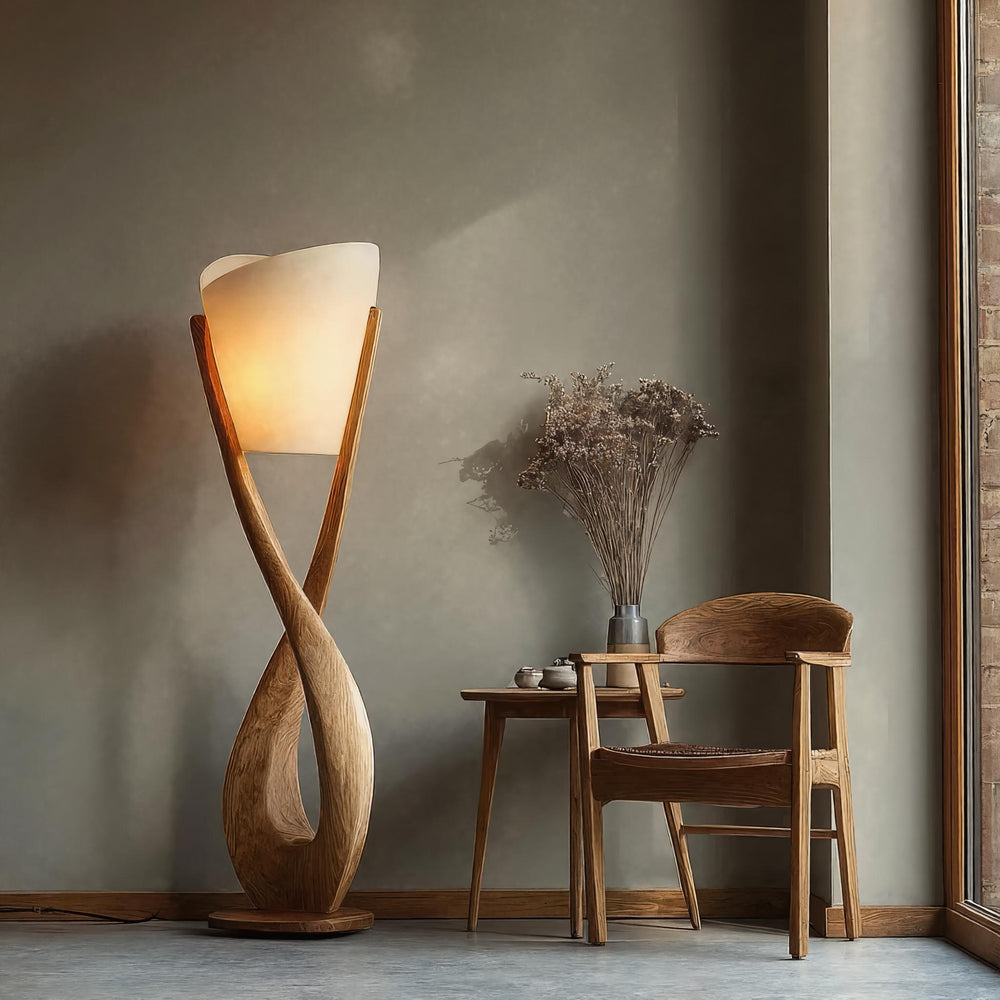 Handcrafted from solid wood with a flowing double-twist base, the Lunara Floor Lamp captures the essence of organic movement and soft, natural light.