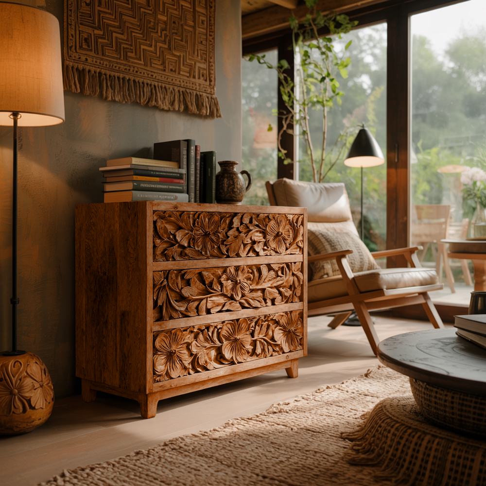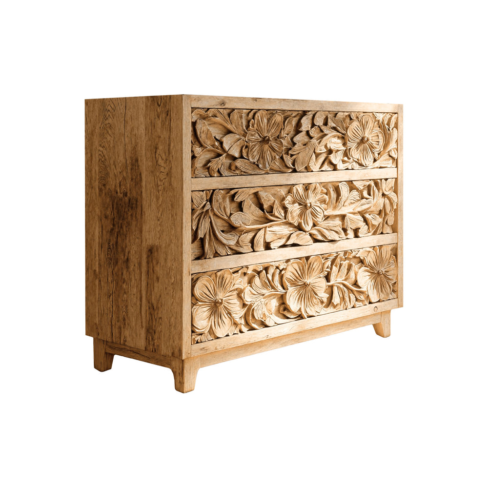 Crafted from solid wood, the cabinet is built with a strong structural core and finished with detailed hand carving on each drawer panel. The floral motifs are carved directly into the wood surface, creating depth, shadow, and tactile richness that cannot be replicated by machine embossing. Each piece is finished by hand to preserve natural grain variation and highlight the sculptural relief.