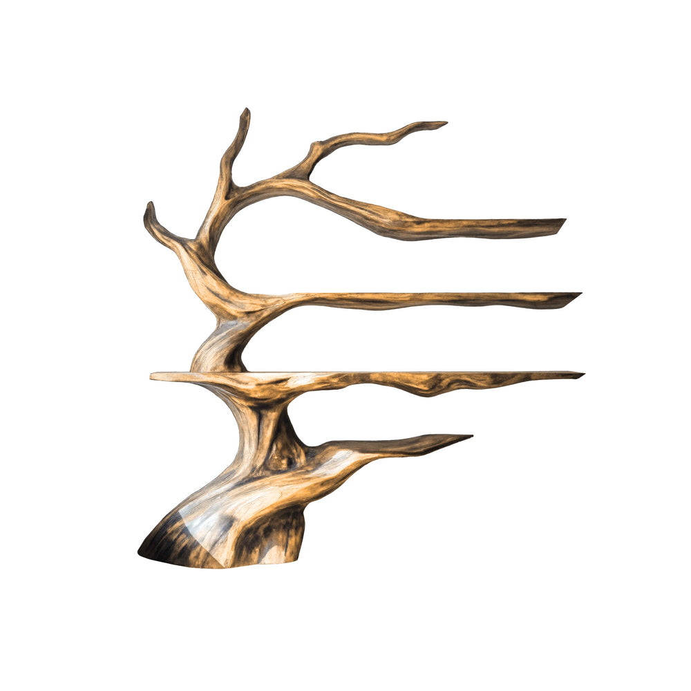 Crafted from rich-toned natural hardwood, Noctaryn Flow is shaped by hand to preserve the dramatic grain patterns and fluid movement within the wood. The trunk and shelves are carved as a continuous form, ensuring seamless transitions and structural harmony. Each surface is carefully refined and finished to enhance durability while maintaining the wood’s depth, contrast, and tactile quality. Natural grain variation ensures that every piece is one of a kind.
