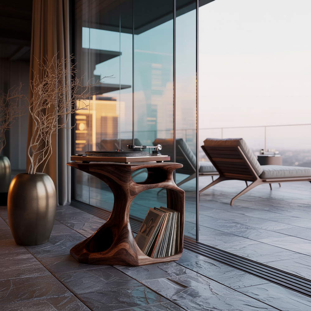 The Resonare Hollow Sculpted Solid Wood Record Player Stand combines performance and sculpture in one expressive form. Its dynamic hollow architecture creates visual depth and a sense of acoustic resonance, ideal for luxury music-focused living spaces.
