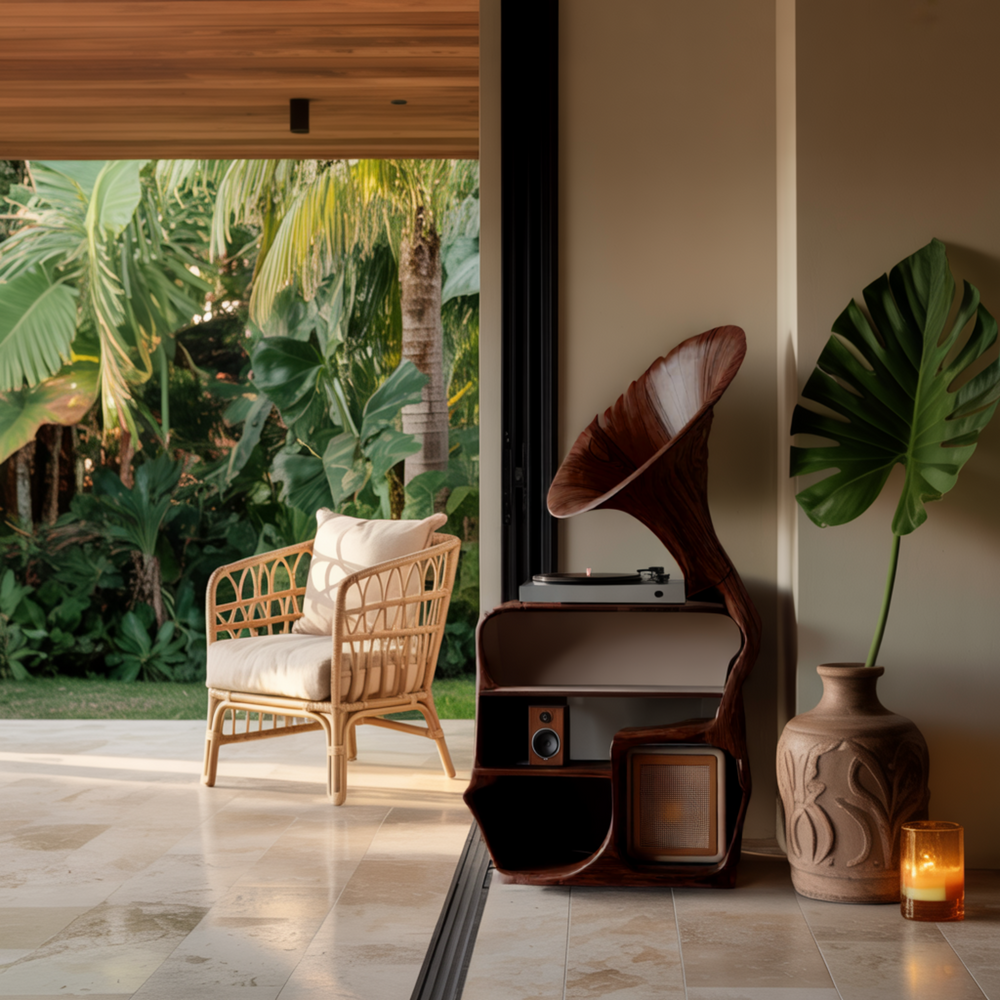 The Sonatone Wooden Record Stand With Storage unites natural craftsmanship and acoustic artistry in a sculptural form. Handcrafted entirely from solid wood, its horn-shaped upper design and flowing structure echo the rhythm of sound waves — turning your music corner into a work of art.