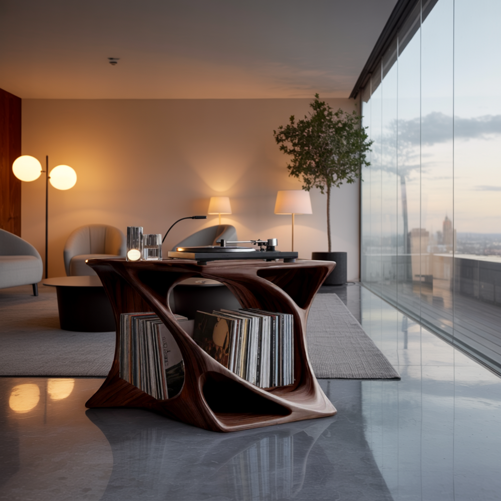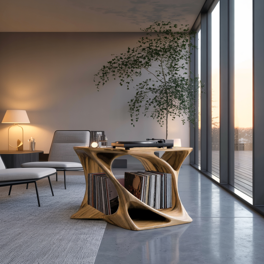 The Torsona Twisted Hollow Solid Wood Record Player Stand introduces a bold sculptural twist into audio-driven spaces. Its diagonal hollow geometry creates a dynamic flow of lines and shadows, offering a statement presence in modern luxury interiors.