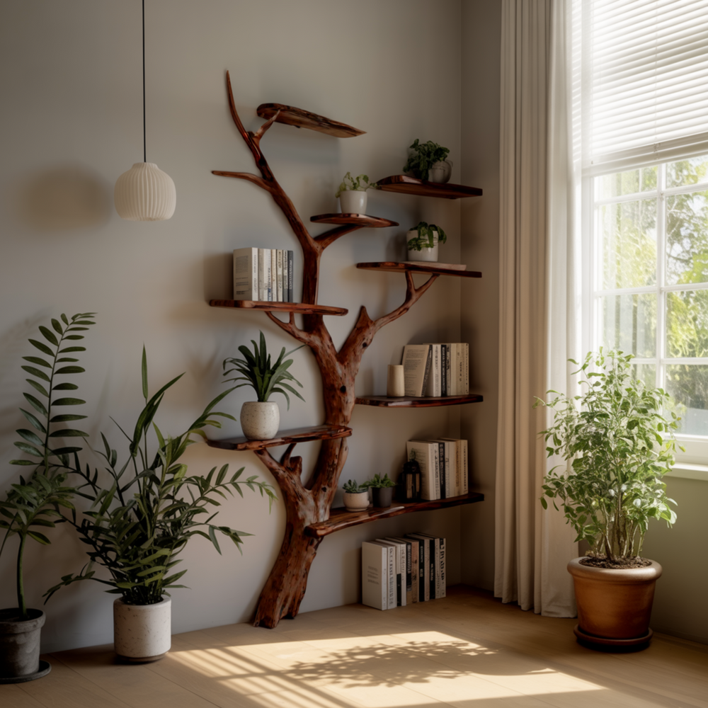 • A wide, multi-branch tree bookshelf featuring layered live-edge shelves for an organic, sculptural look.