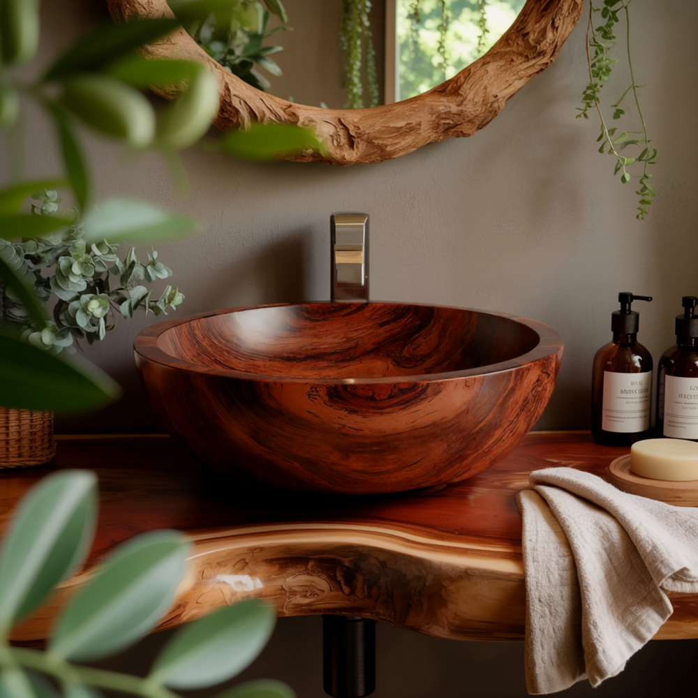 Handcrafted from solid wood, the Arborflow Vessel Sink reveals the natural rhythm of grain and time. Each basin is carved and polished by hand to maintain the original patterns of the timber — gentle swirls, warm knots, and organic depth. A water-resistant matte finish preserves the tactile beauty of the wood while ensuring durability for daily use.