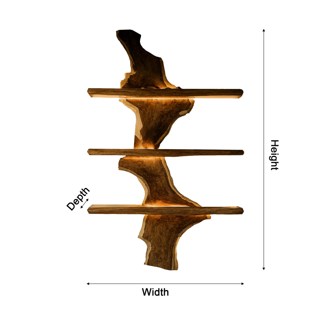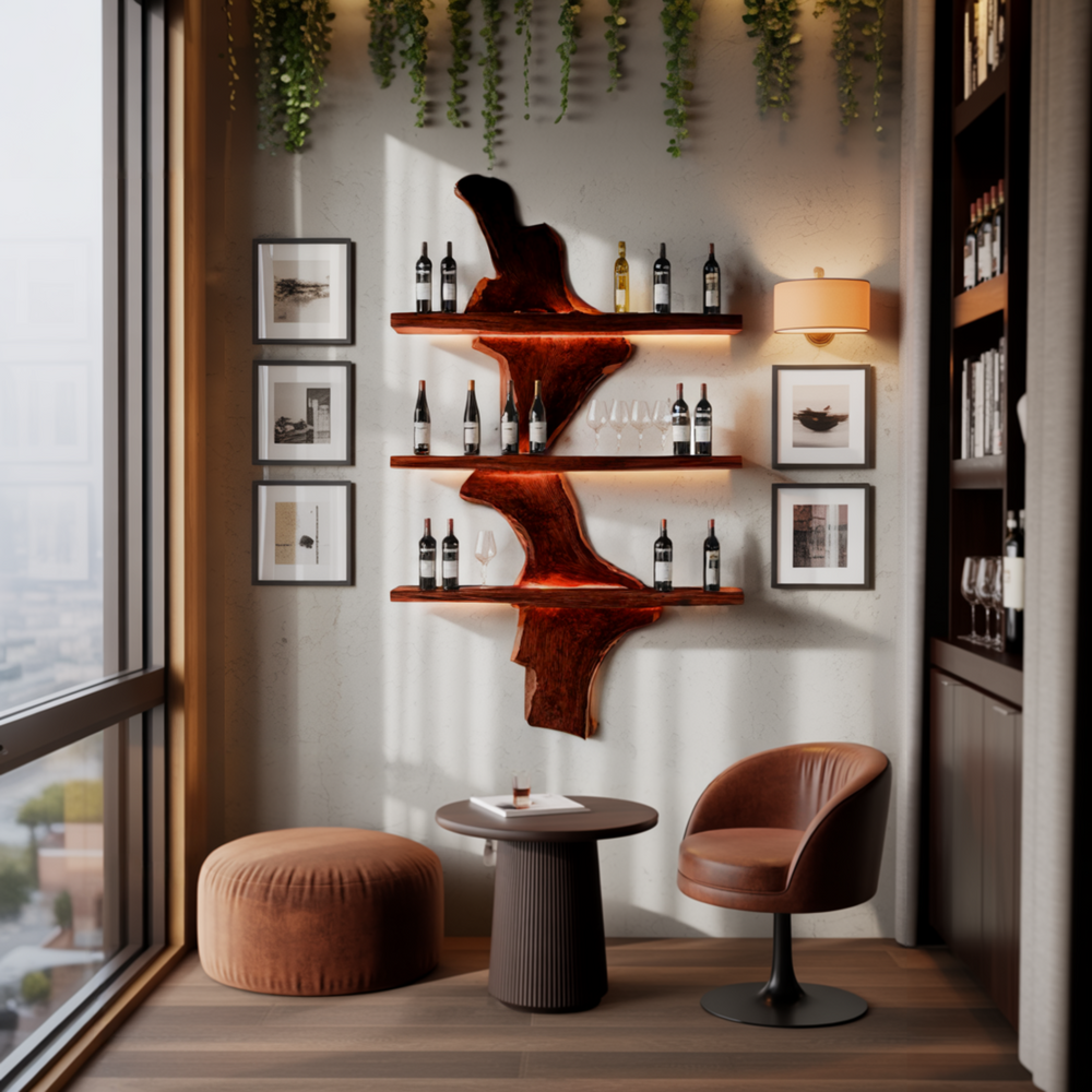 Handcrafted from a single slab of solid walnut, this floating wine rack preserves the organic contours of the tree. Each tier is sanded and sealed by hand, revealing grain patterns that echo river currents and age rings — a quiet celebration of natural imperfection.